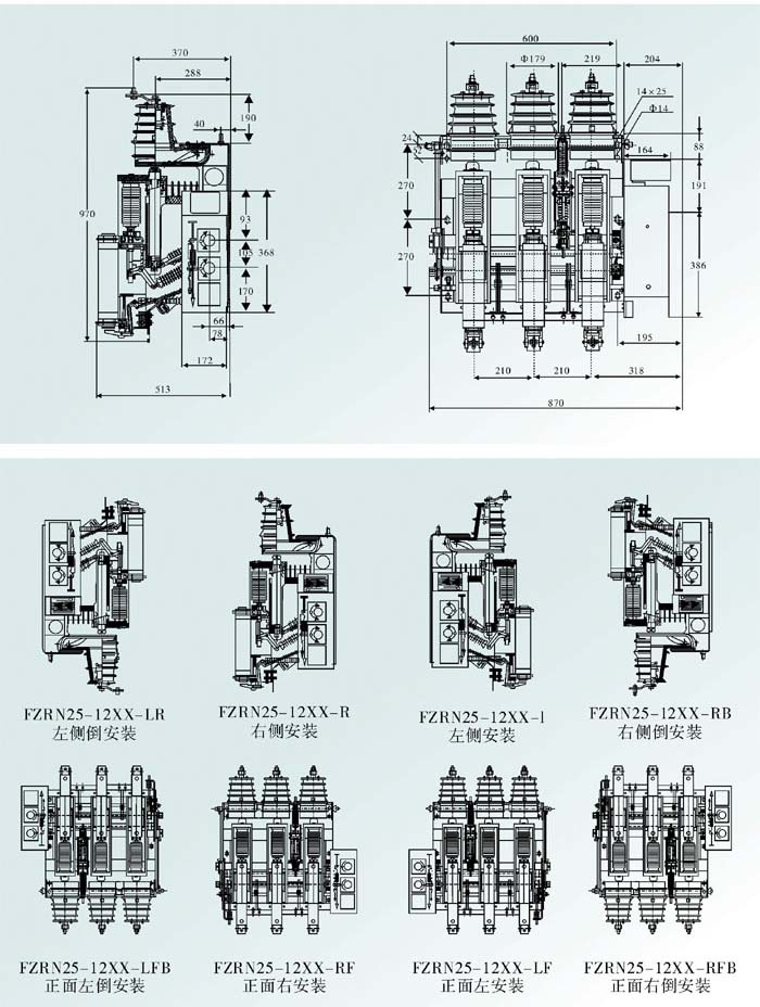 FZRN25-12型真空負(fù)荷開關(guān)和FZRN25-12型組合電器、總體結(jié)構(gòu)采用操作機(jī)構(gòu)布置于主回路側(cè)面的形式。(可根據(jù)用戶需求提供主回路右、左側(cè)面或正面的形式)。主導(dǎo)電部分由絕緣罩、靜觸頭、活門、導(dǎo)電筒、真空滅弧室等構(gòu)成,組合電器還有限流熔斷器。